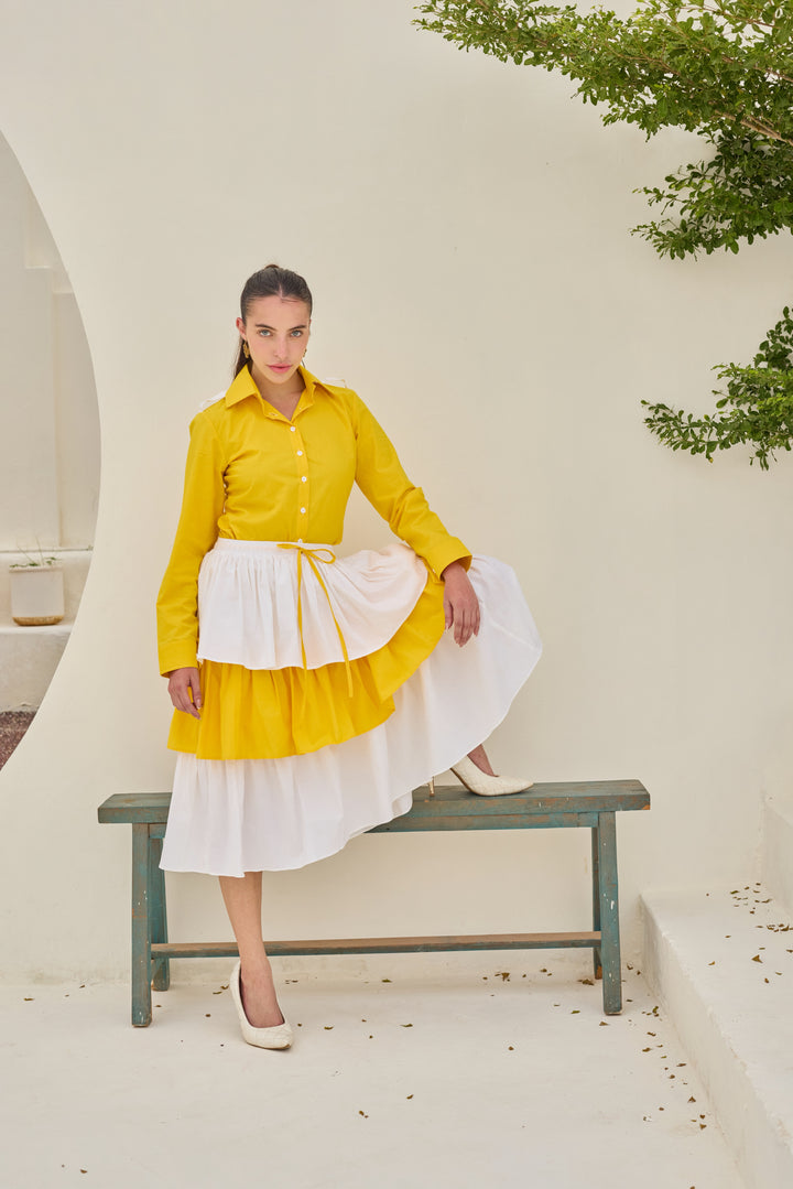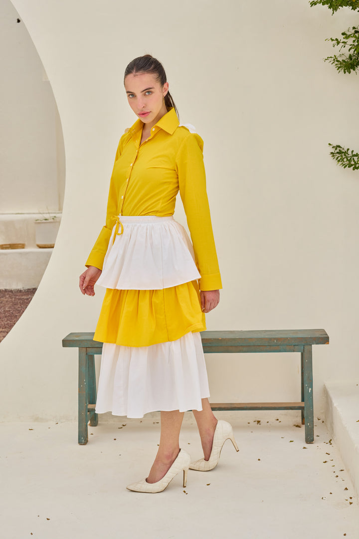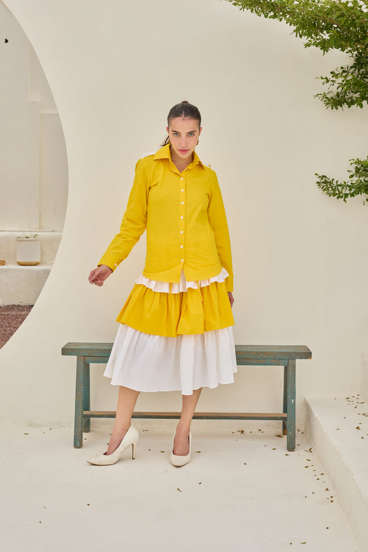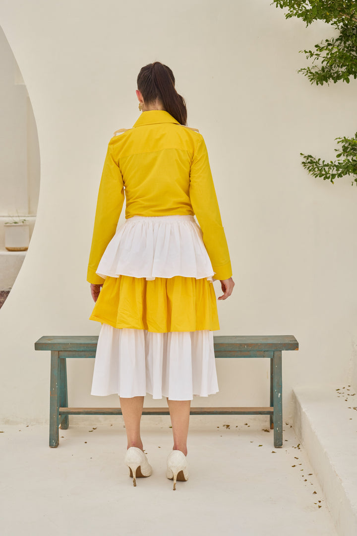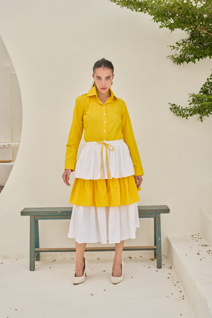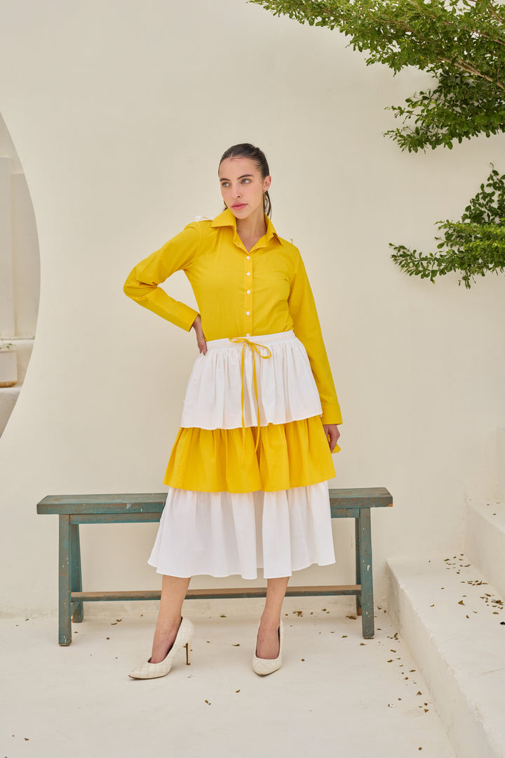 The Buttercup skirt set features a vibrant yellow long-sleeved shirt with a classic collar and button-down front, paired with a matching tiered skirt. The skirt has a layered design with alternating yellow and white ruffles, cinched at the waist with a yellow tie.