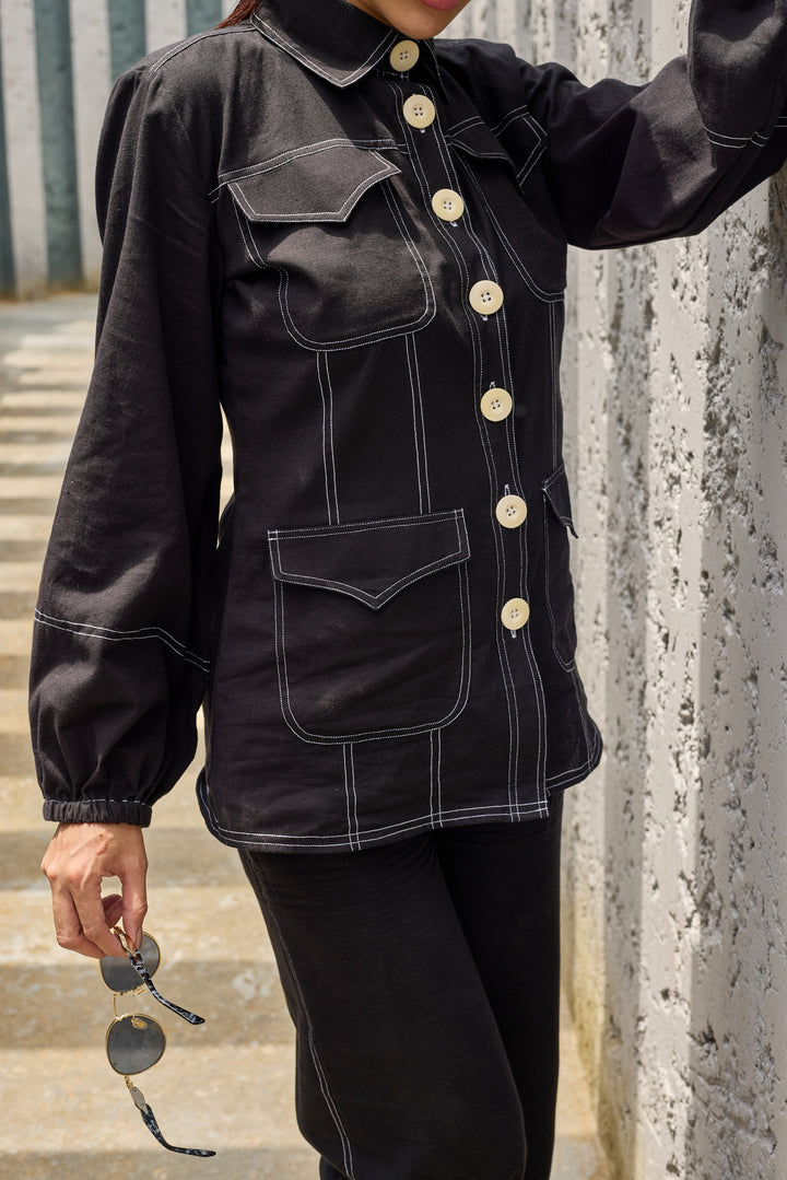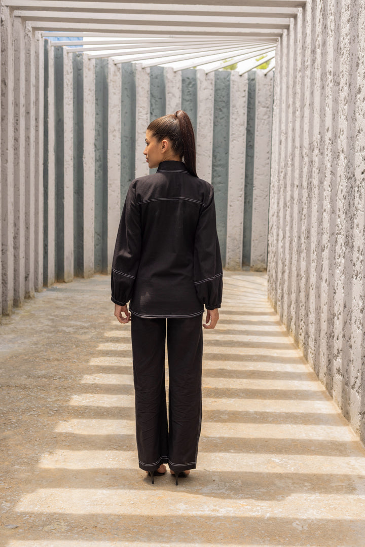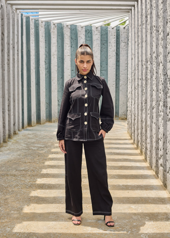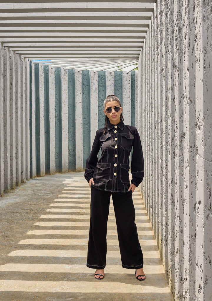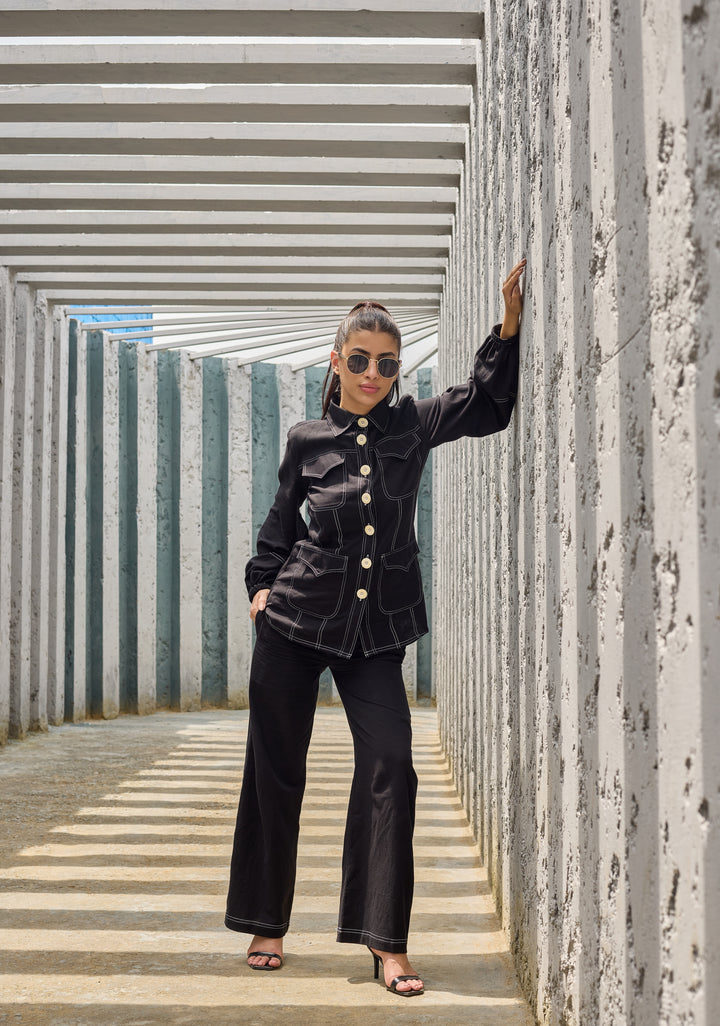 The outfit consists of a stylish black ensemble featuring a long-sleeved jacket style shirt with a button-down front, accented with white stitching and large buttons. The jacket style shirt has a relaxed fit with flap pockets on the chest. Paired with it are matching black wide-leg pants, also detailed with white stitching along the seams, creating a cohesive and modern look.