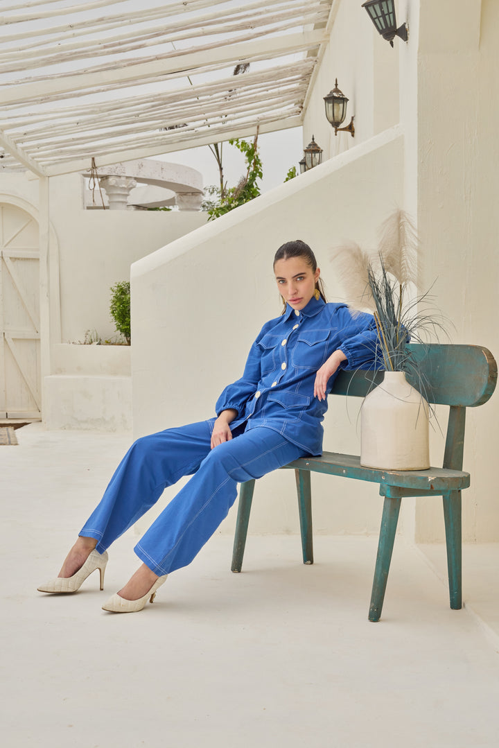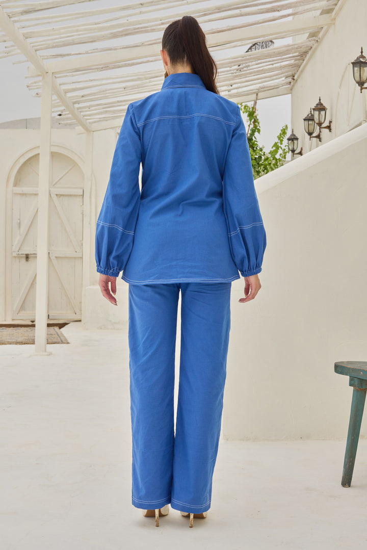 The outfit consists of a stylish blue ensemble featuring a long-sleeved jacket style shirt with a button-down front, accented with white stitching and large buttons. The jacket style shirt has a relaxed fit with flap pockets on the chest. Paired with it are matching blue wide-leg pants, also detailed with white stitching along the seams, creating a cohesive and modern look.