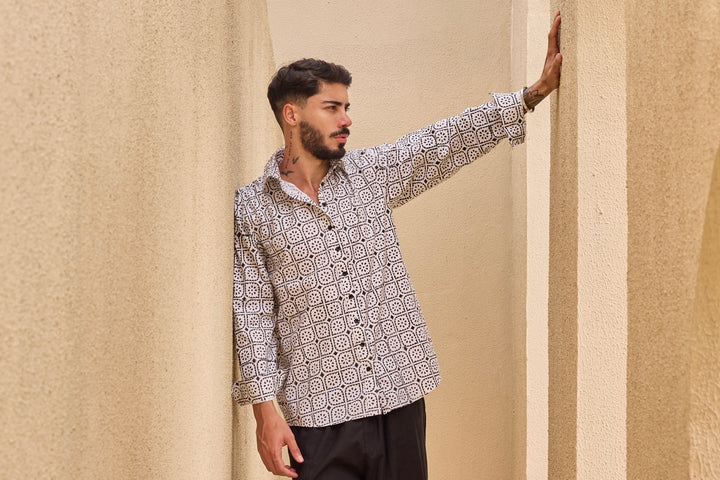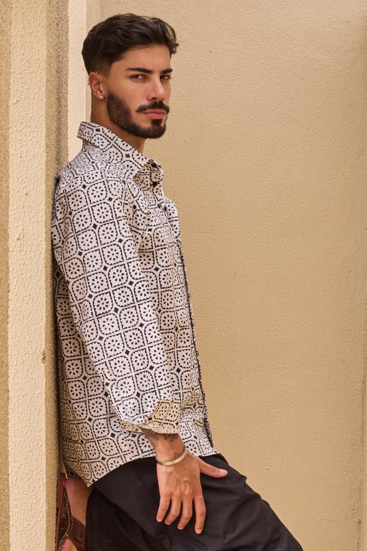 a perfect fusion of contemporary design and casual comfort. Crafted from a lightweight cotton blend, this long-sleeved shirt features a striking black geometric pattern against a crisp white base, offering a vibrant yet versatile look.