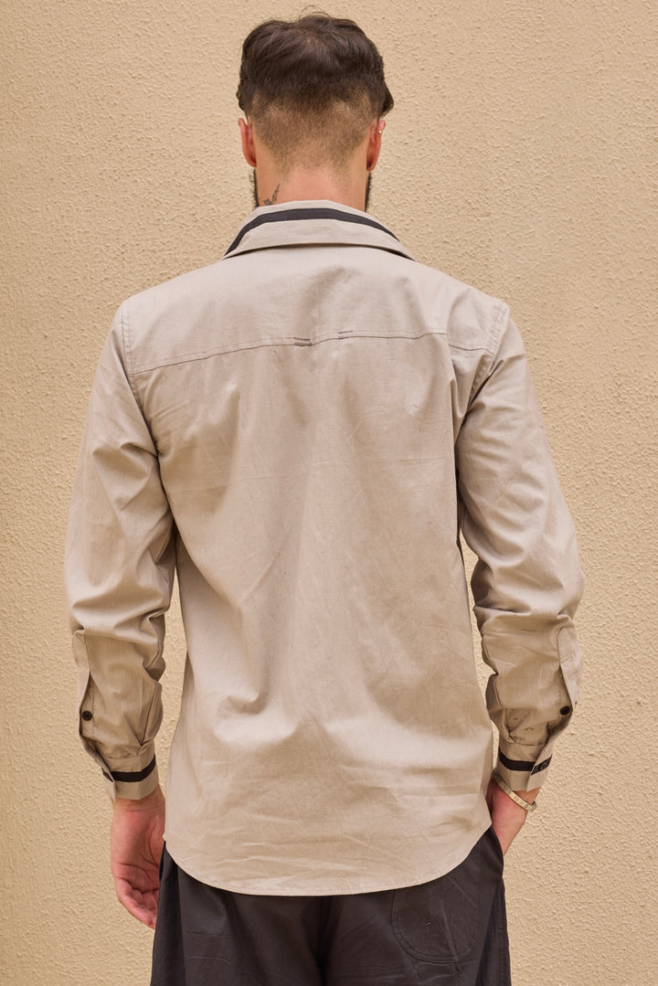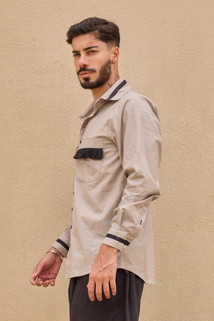 The outfit features a grey long-sleeve shirt with a button-down front, accented with black ruffles on the chest pocket and black trim on the cuffs - designed in premium cotton fabric.