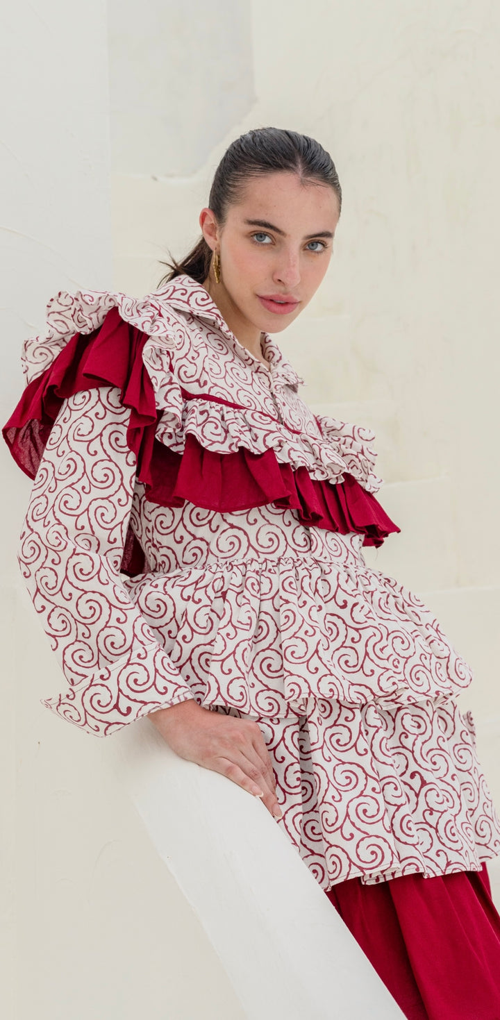 The dress features a voluminous, tiered silhouette with multiple ruffles, creating a dramatic and eye-catching effect. This intricate hand print adds a touch of elegance and sophistication.