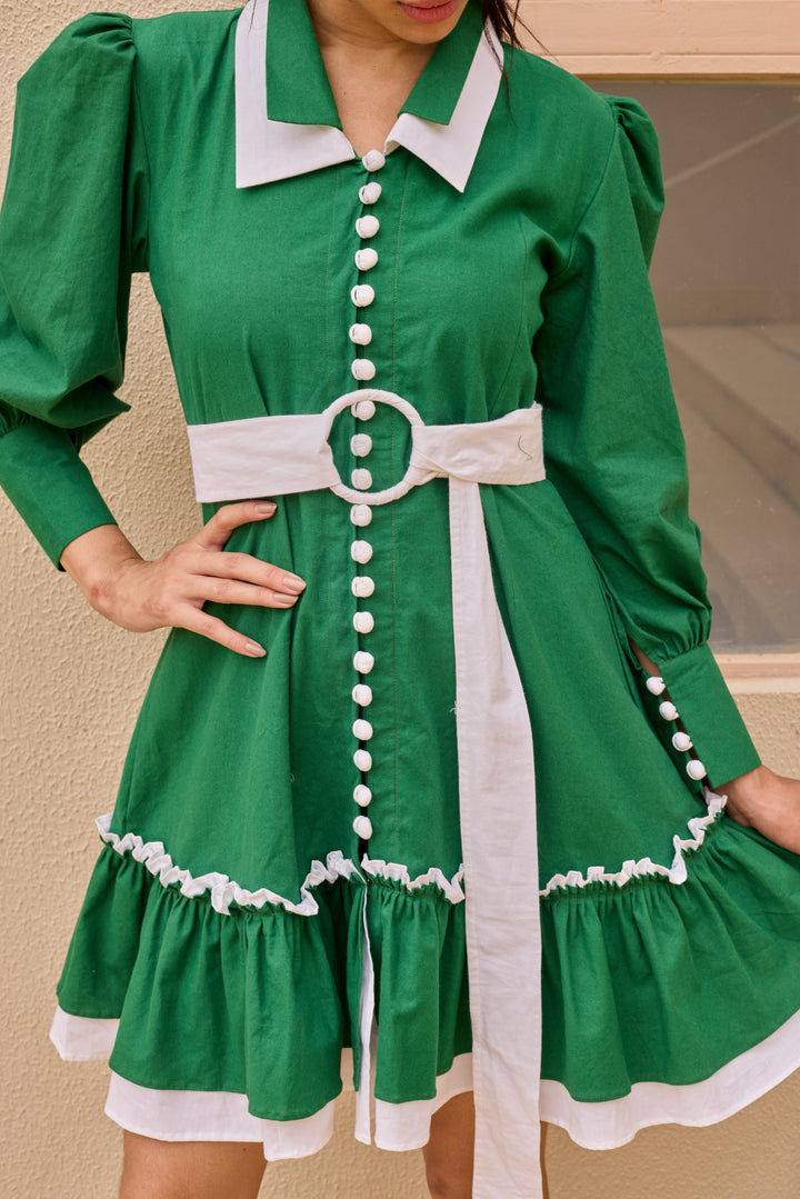 Features a collared neckline with a button-down front, long puffed sleeves, and a fitted waist. The skirt has a ruffled hem with white trim, adding a playful yet elegant touch. The dress includes a wide white belt with a circular buckle, cinching the waist for a flattering silhouette.