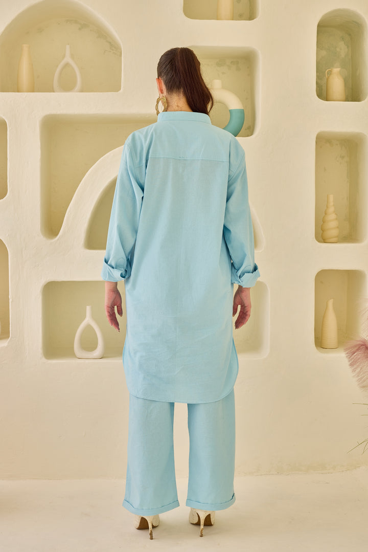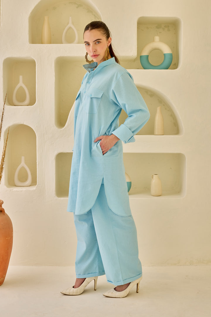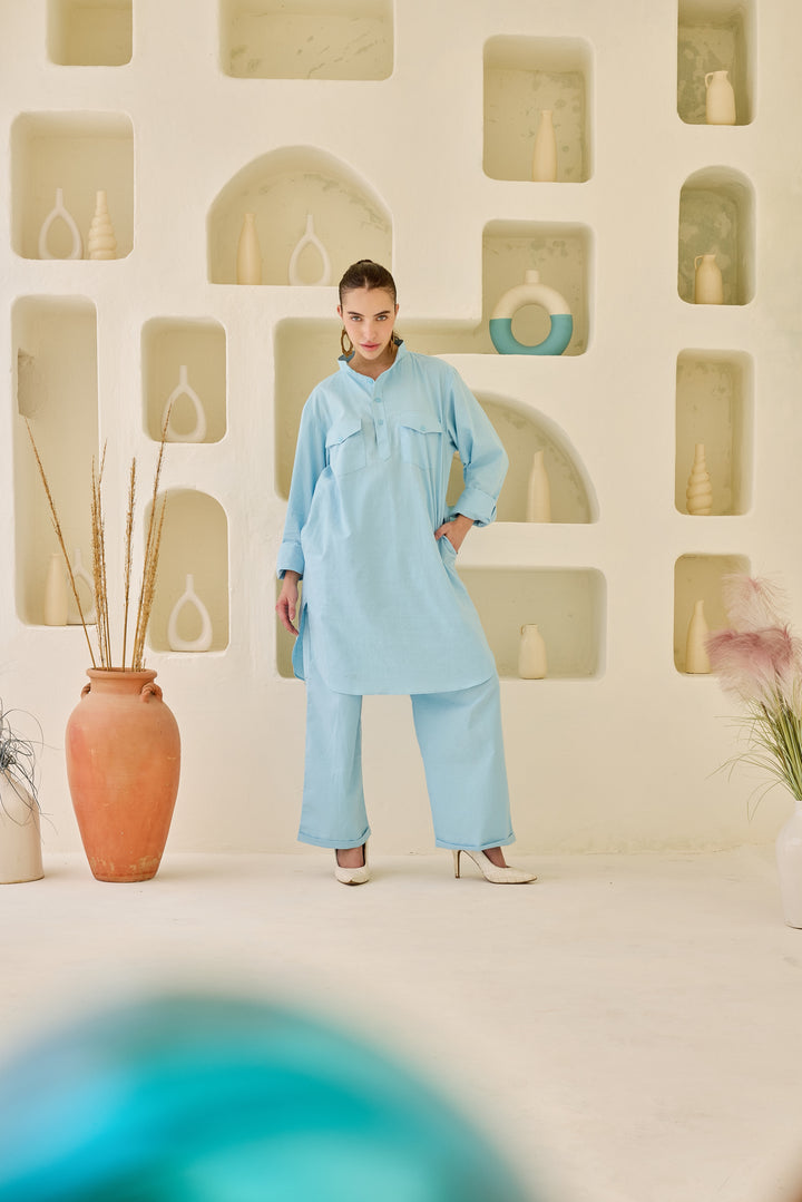 A long, loose-fitting kurta in a soothing ice blue shade. It features a straight cut with long sleeves, a mandarin collar, and a front button placket with a few visible buttons. The design is minimalistic, offering a clean and sophisticated silhouette.