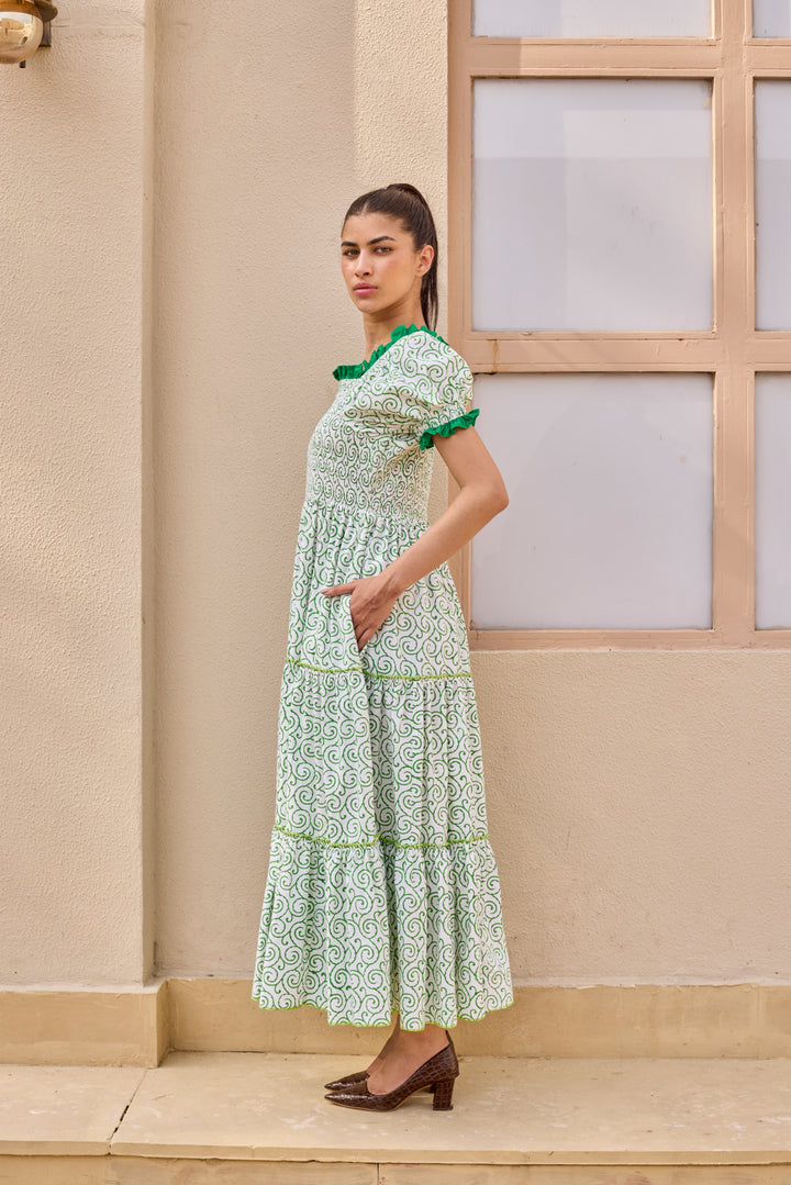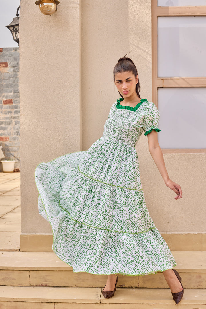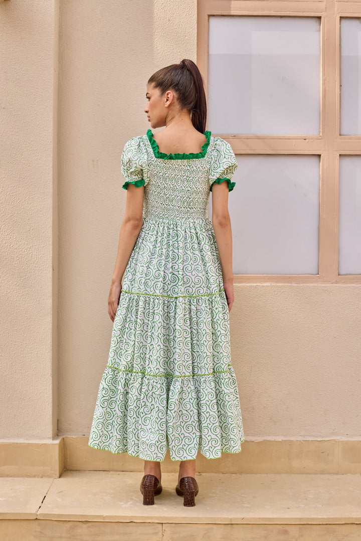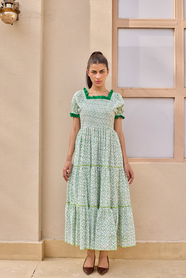 The dress boasts a smocked bodice, short ruffled sleeves, and tiered layers with green trim, creating a flattering and airy silhouette.