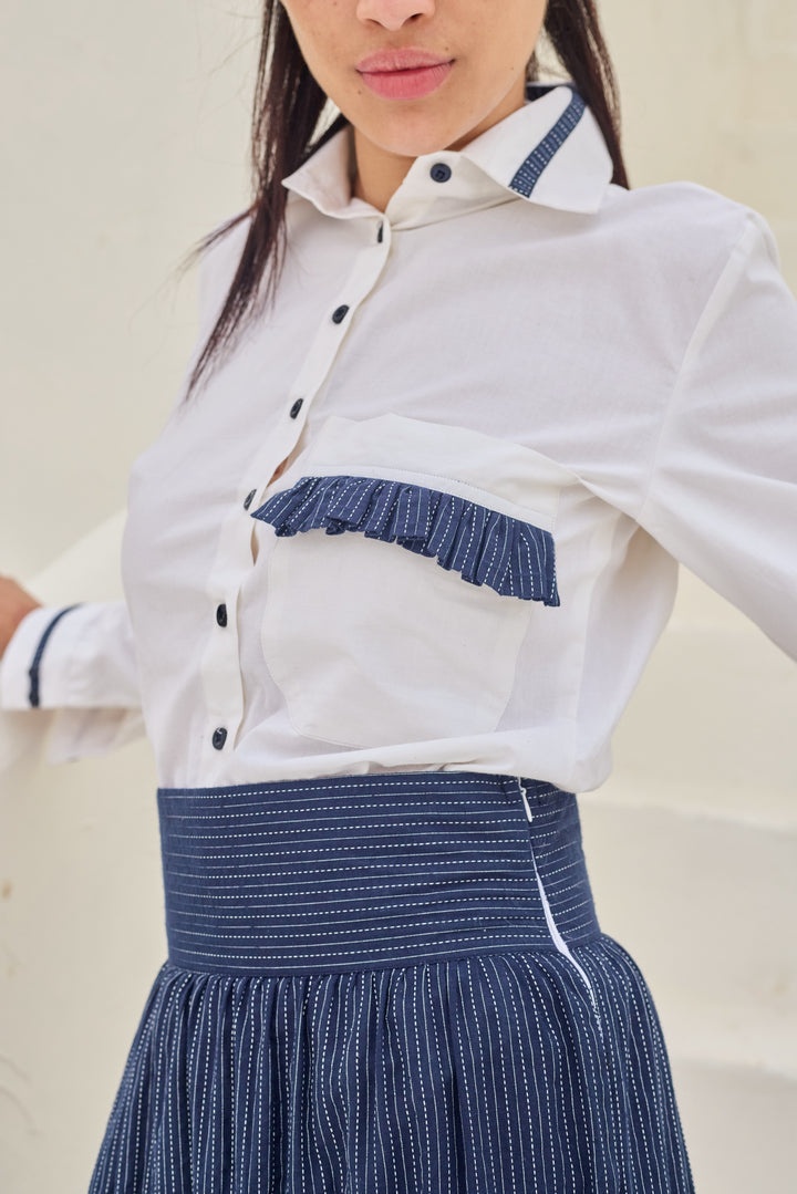 Features blue trim along the collar, cuffs, and a ruffled pocket detail on the chest, adding a subtle contrast.