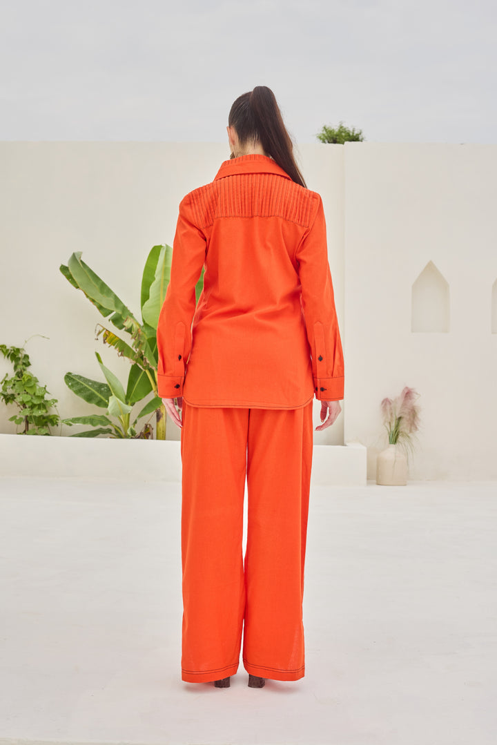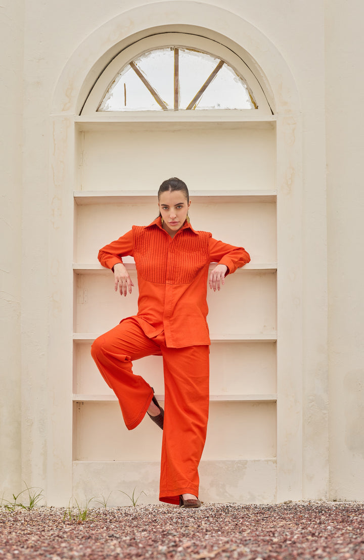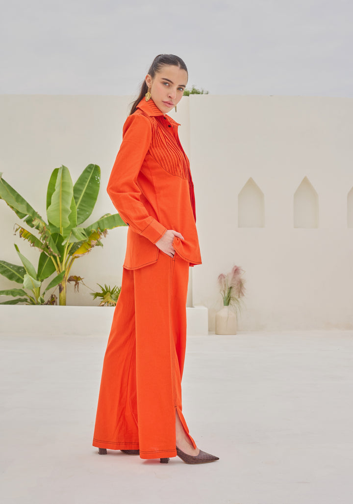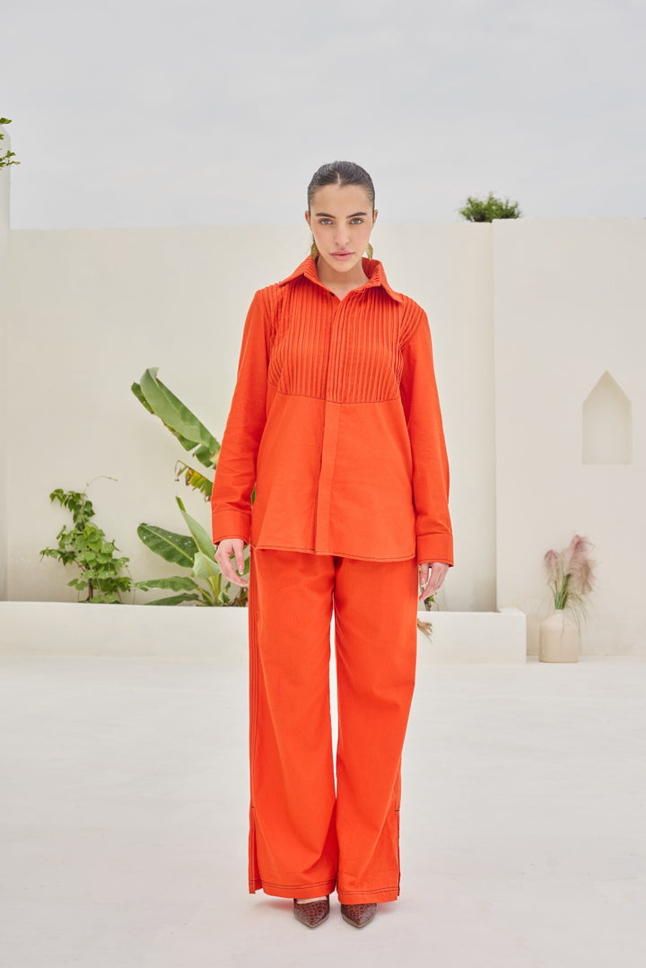 The outfit consists of a vibrant orange two-piece set. The top is a long-sleeved shirt with a pintex neckline, featuring pleated detailing across the chest and a relaxed fit.