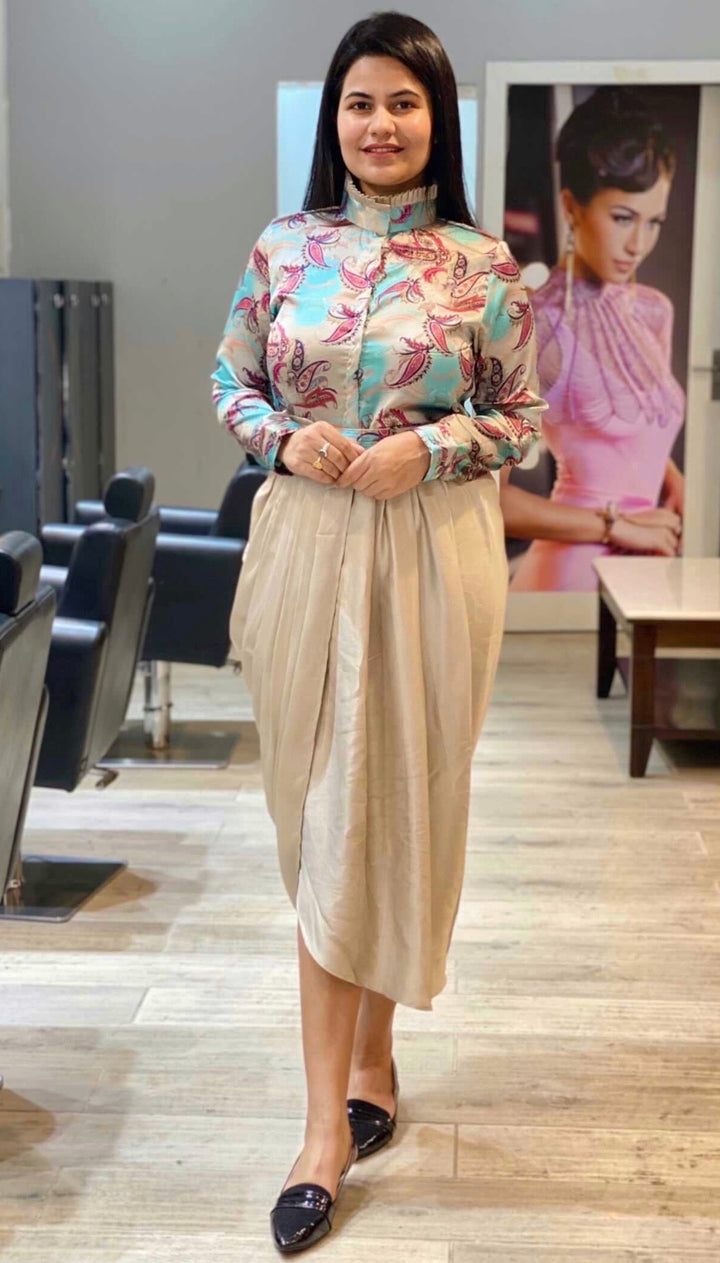 The outfit showcases a striking turquoise & silver adorned with intricate paisley prints, complemented by a soft silver drape skirt which is attached with the top.