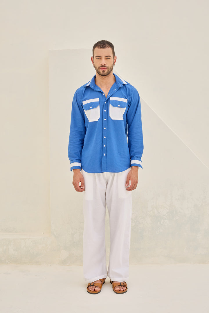 The outfit features a vibrant blue long-sleeved button-up shirt with a relaxed fit. The shirt has a white collar and white chest pockets with blue trim, adding a contrasting detail. The sleeves are unrolled, and the shirt is worn untucked. It is paired with Pull on trouser .