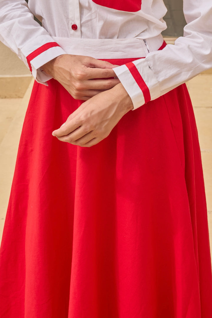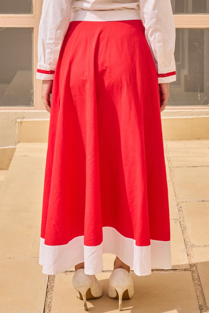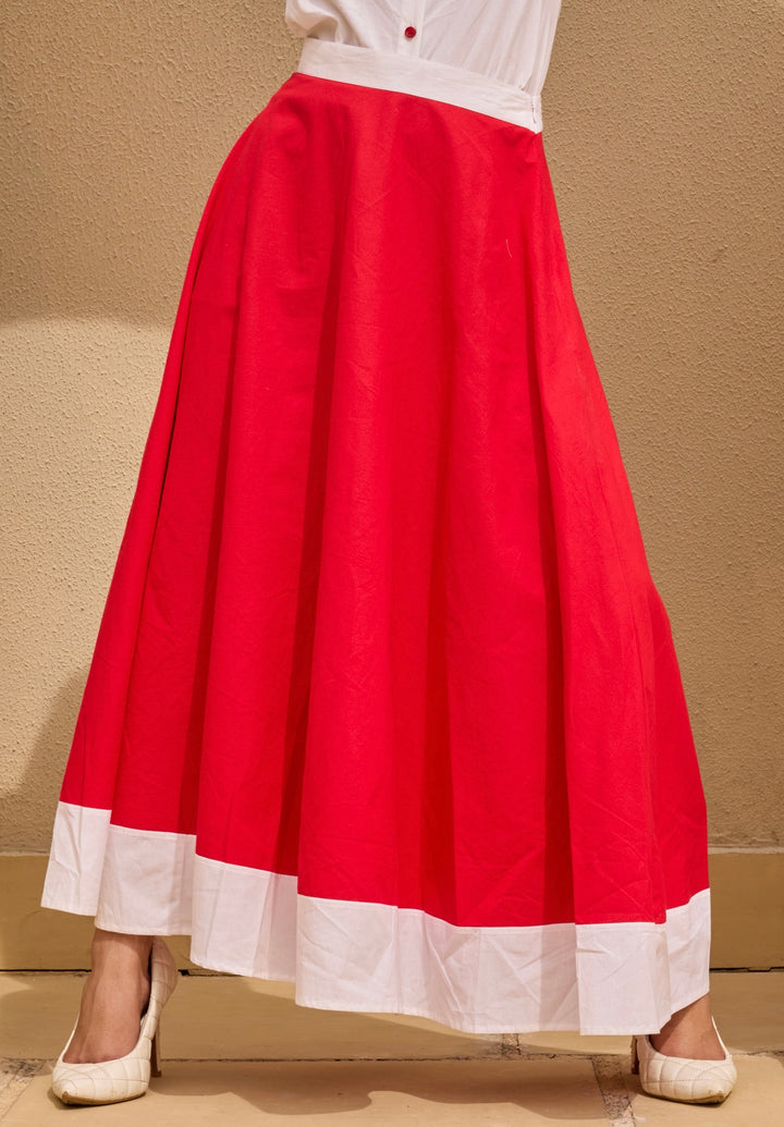 The skirt is a vibrant red midi-length skirt with a full, flowing silhouette. It features a contrasting white hemline that adds a striking detail , designed in premium fabric with pocket on a side .