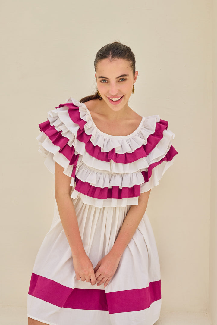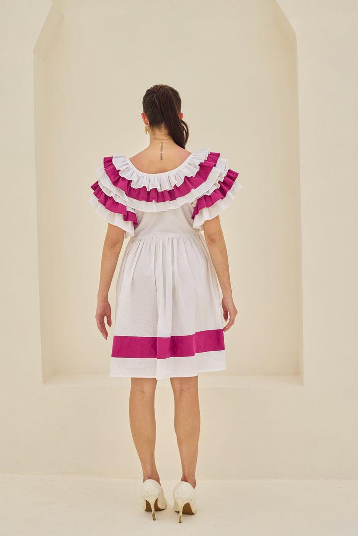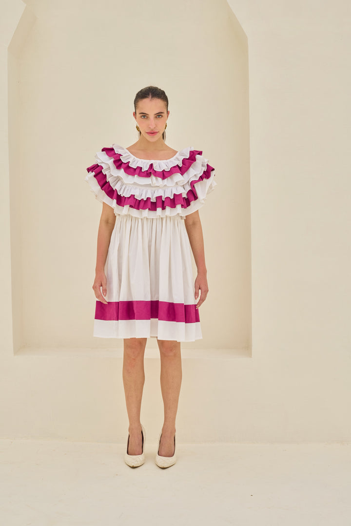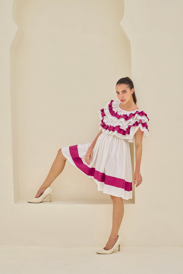 The outfit is a knee-length dress featuring a striking design with multiple layers of ruffled detailing. The upper part showcases a combination of white and magenta ruffles, creating a bold, off-shoulder effect with short sleeves.