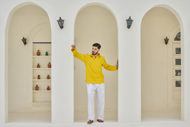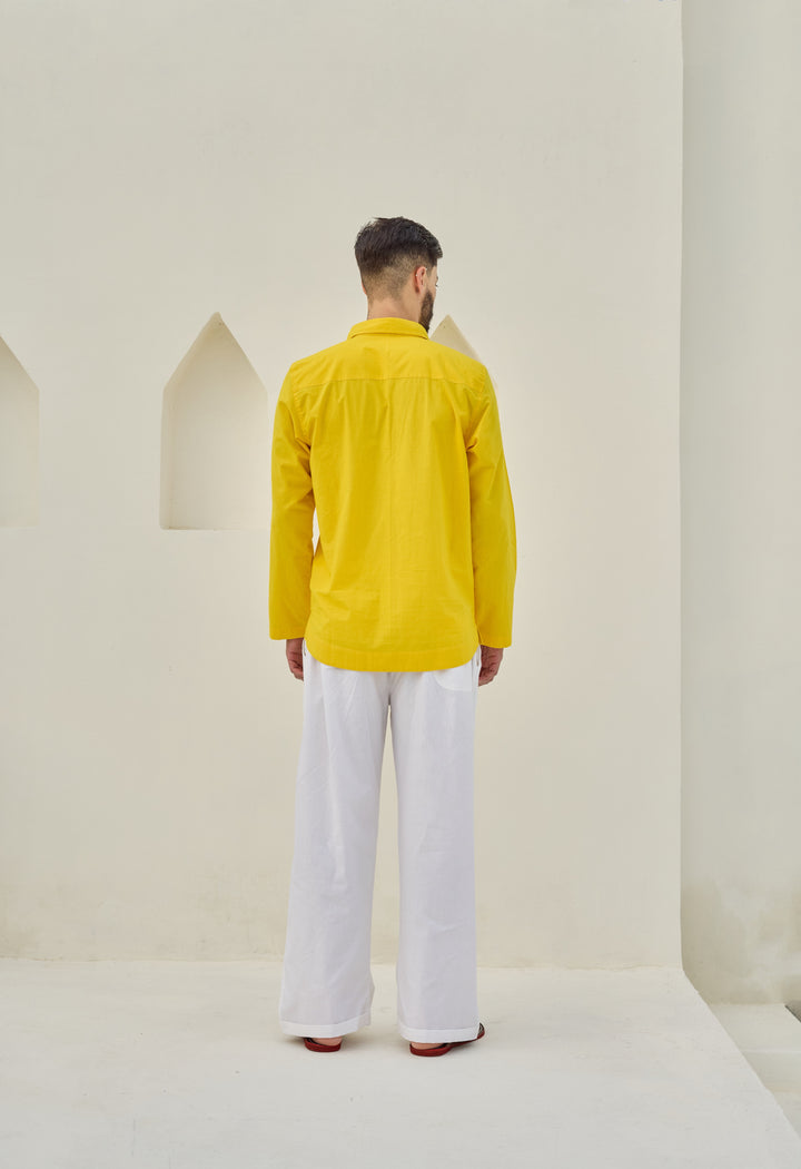 The kurta shirt has a clean, minimalist design with a slightly loose fit, enhancing its comfortable and versatile appeal.