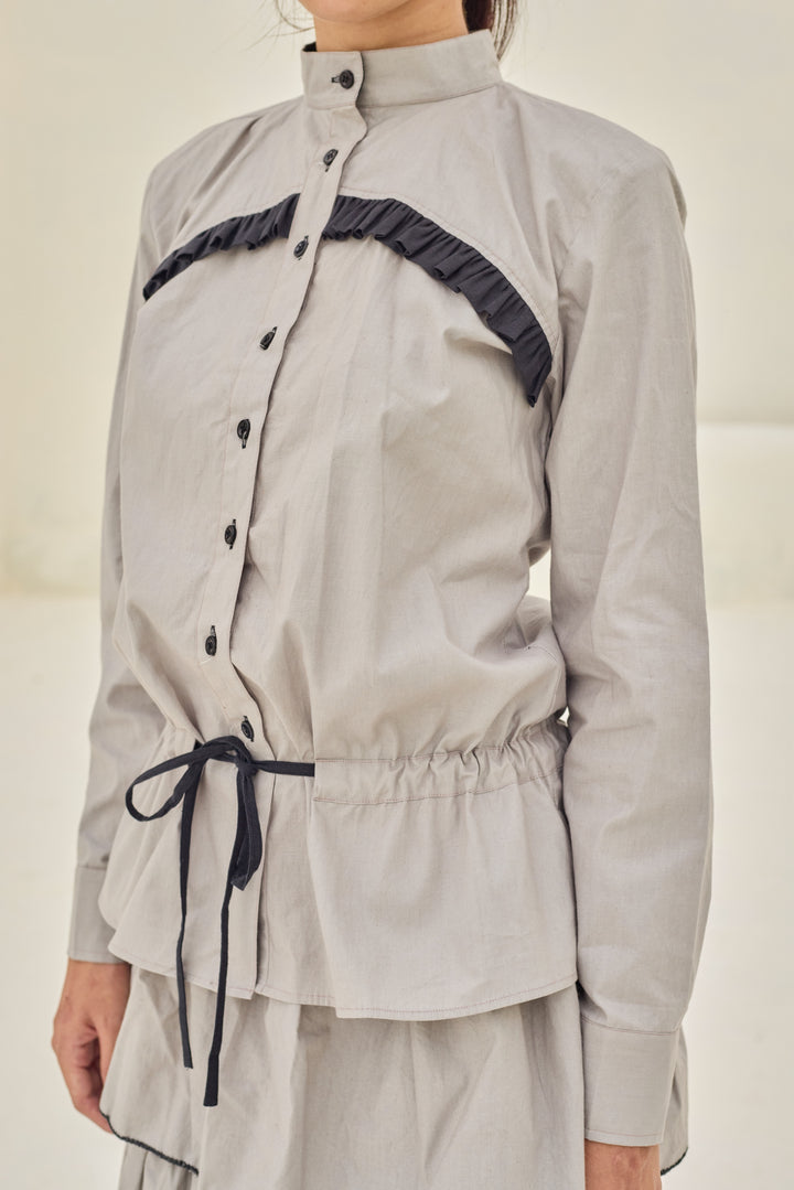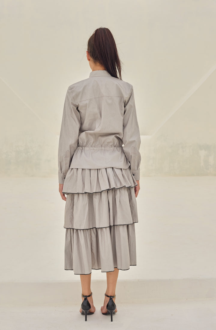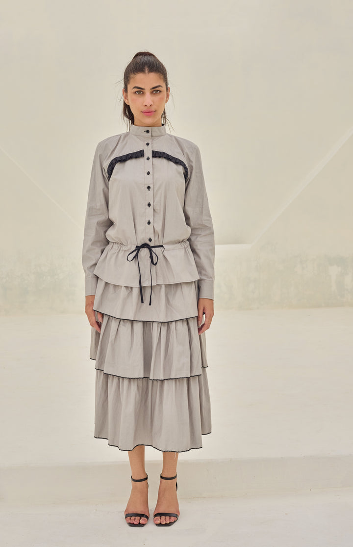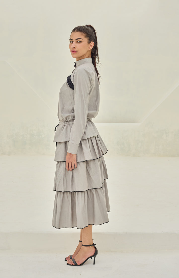 The dress is a light gray, long-sleeve garment with a buttoned front, featuring a black trim around the collar and cuffs. It has a cinched waist with a black tie detail and a tiered, ruffled skirt that adds volume.