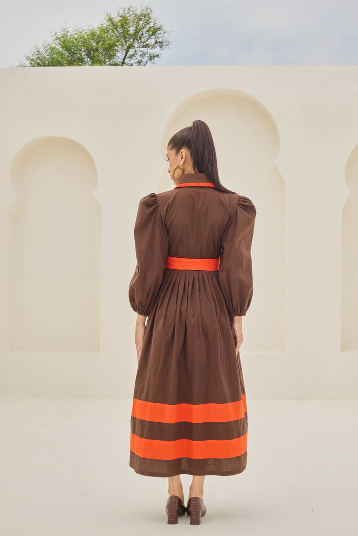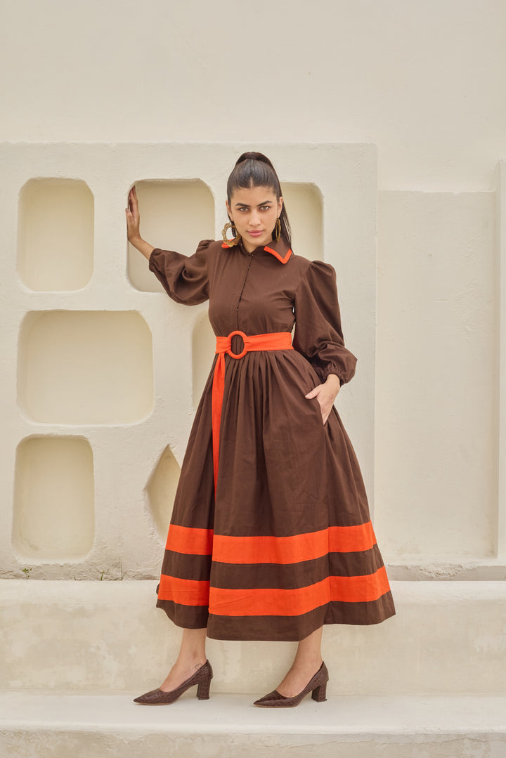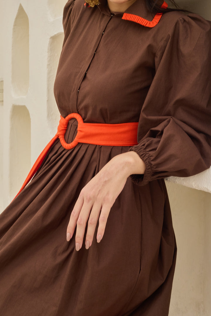 The dress features long sleeves with puffed shoulders and elastic cuffs, a collared neckline with an orange trim, and a cinched waist highlighted by a wide orange belt with a circular buckle. The lower part of the dress has two horizontal orange bands, adding a bold contrast.