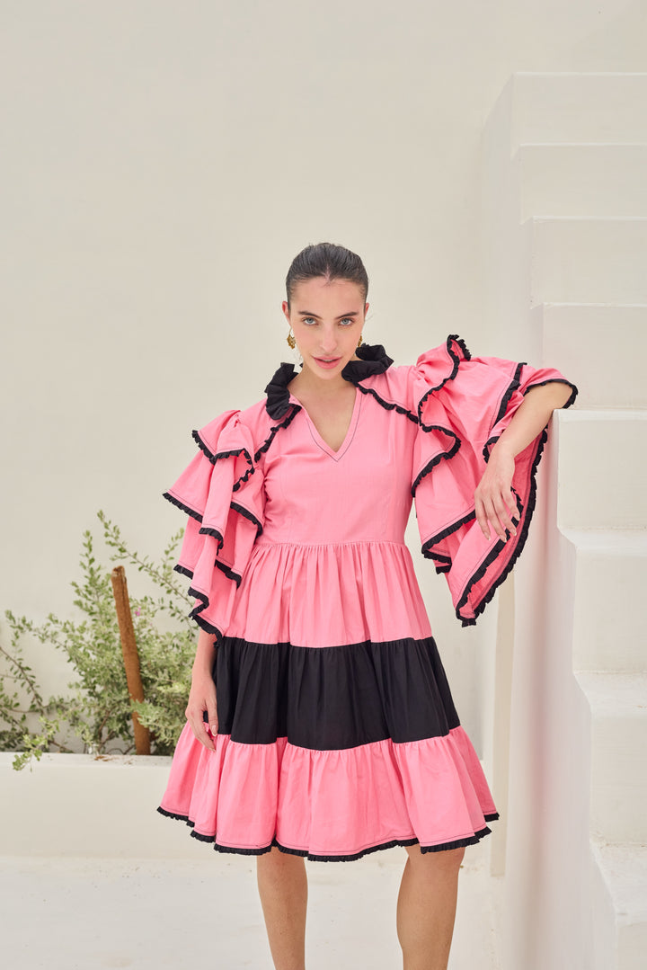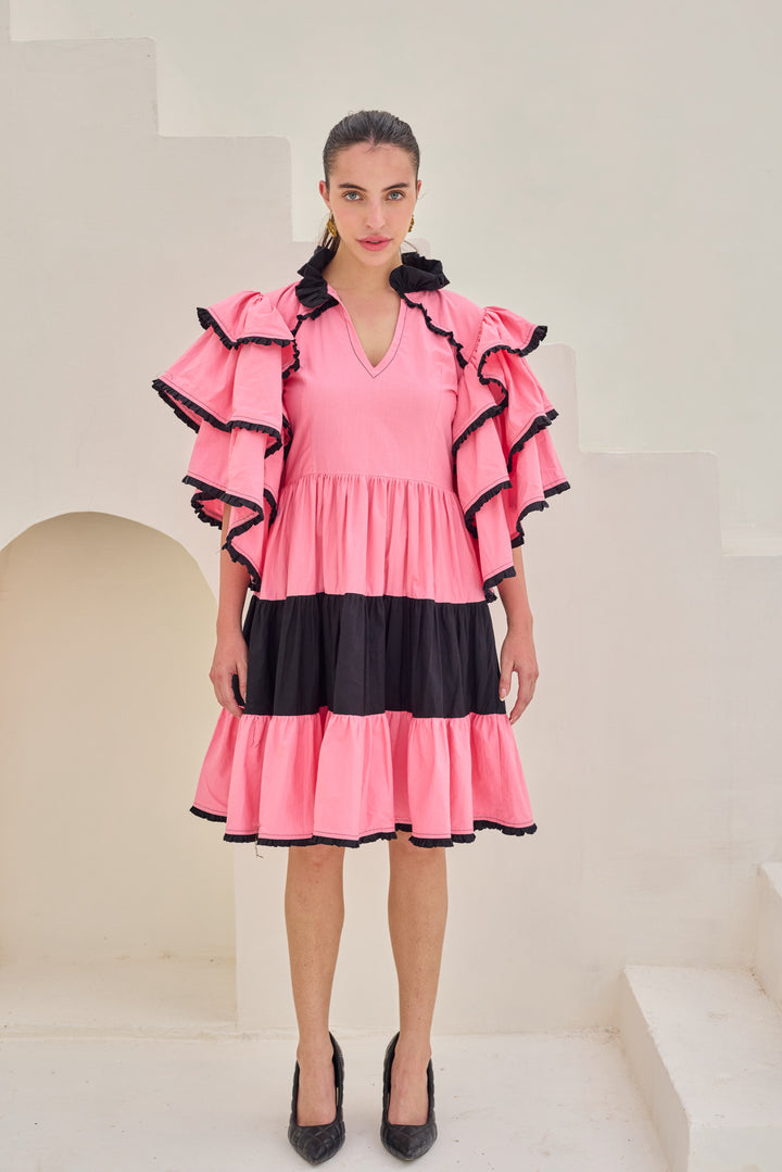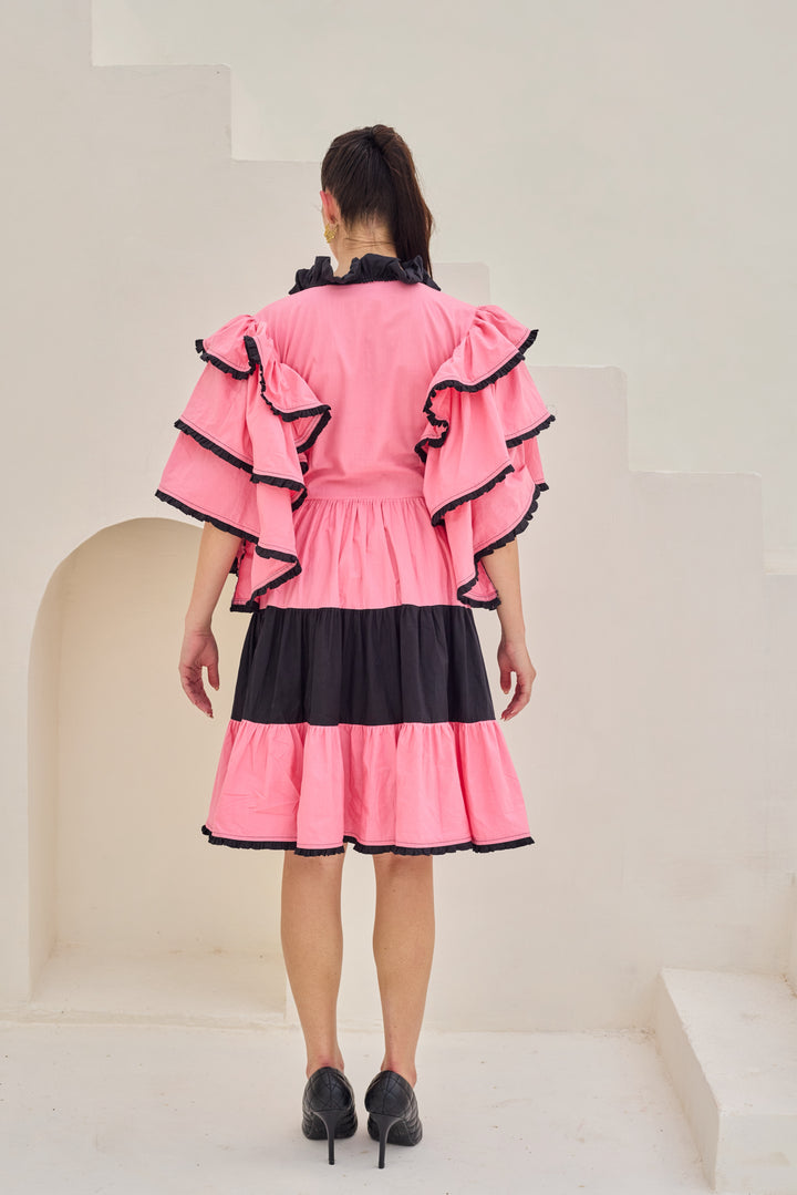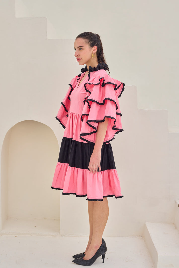 The vibrant dress features a striking pink hue with a V-neckline and voluminous ruffled sleeves adorned with black trim. The dress has a tiered design with a central black band separating the upper pink section from the lower pink ruffles, also accented with black trim. Designed in premium fabric.