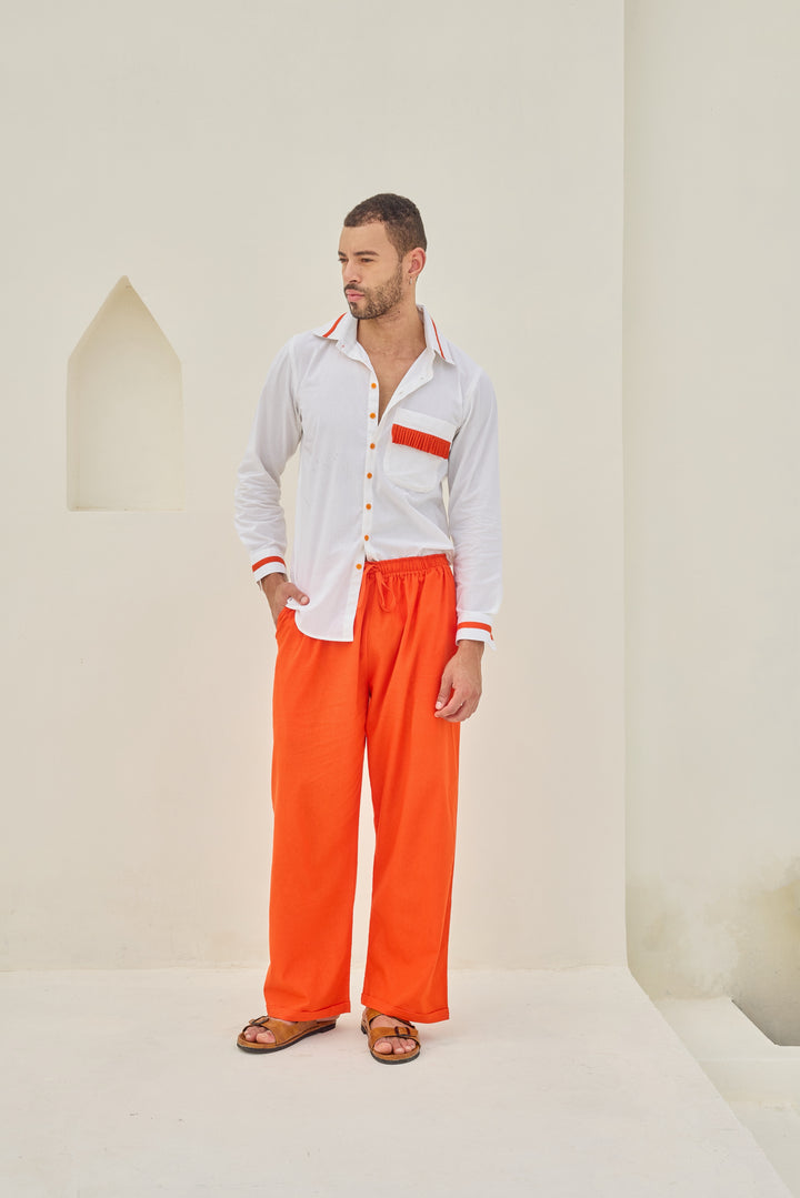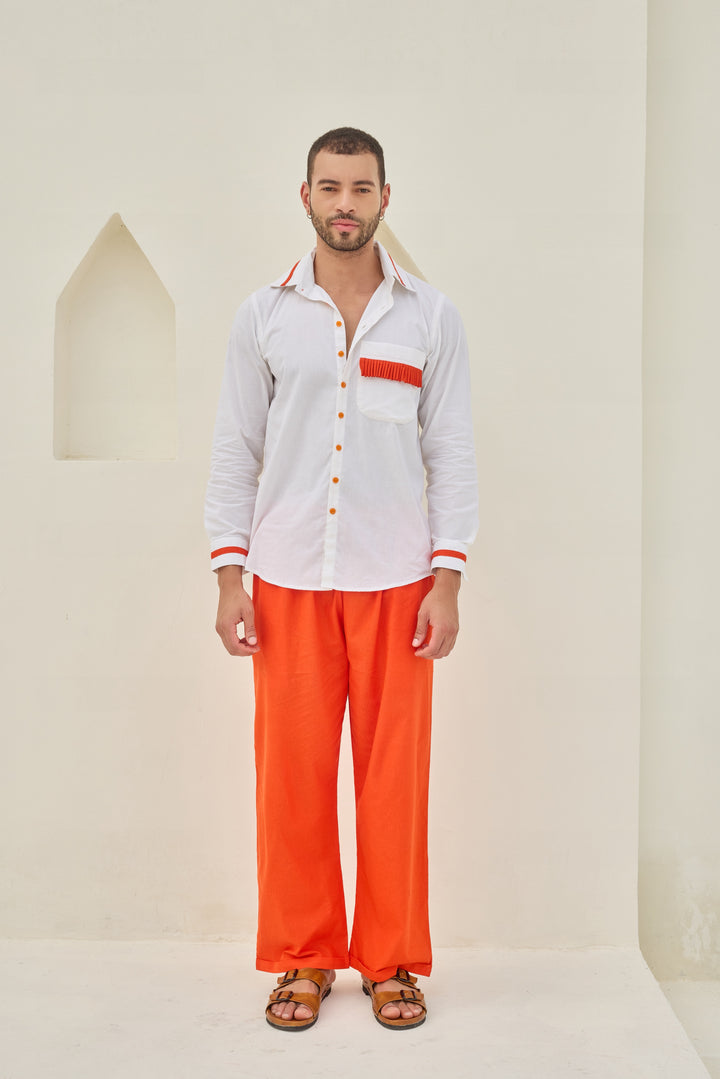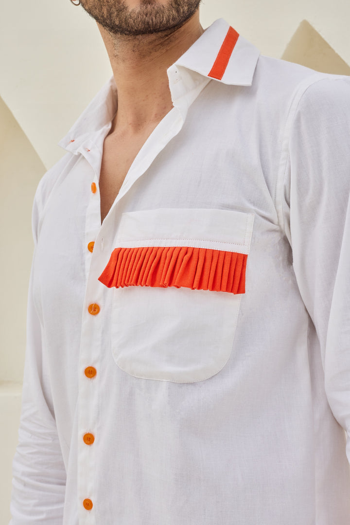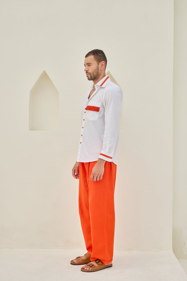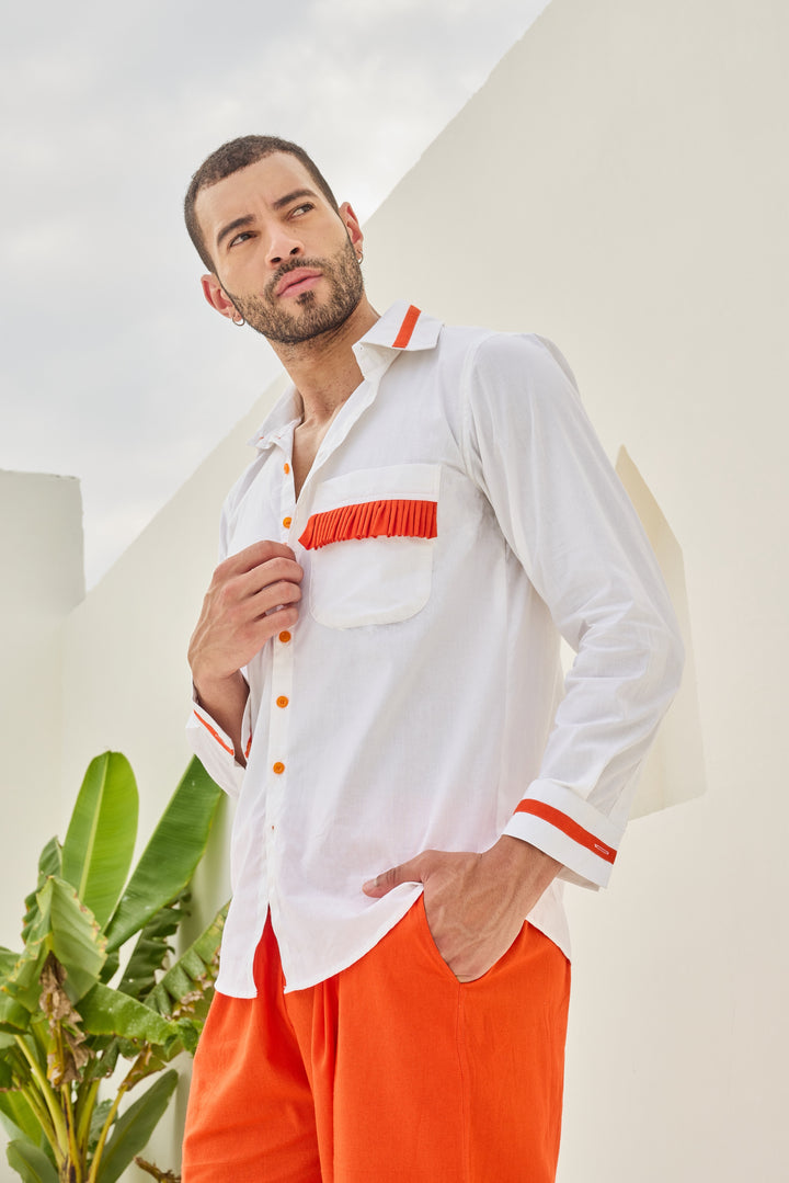 The outfit consists of a white long-sleeve shirt with a button-down front, featuring orange accents on the collar, chest pocket, and cuffs.