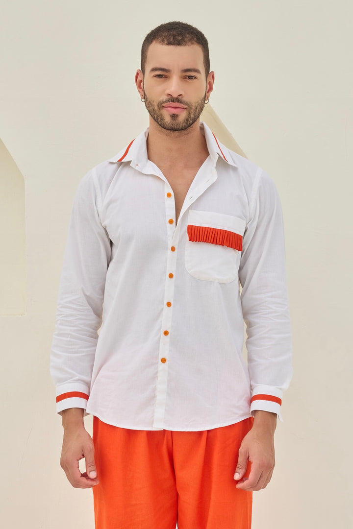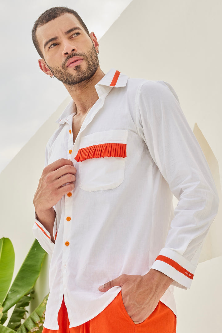 The outfit consists of a white long-sleeve shirt with a button-down front, featuring orange accents on the collar, chest pocket, and cuffs - designed in premium cotton fabric.