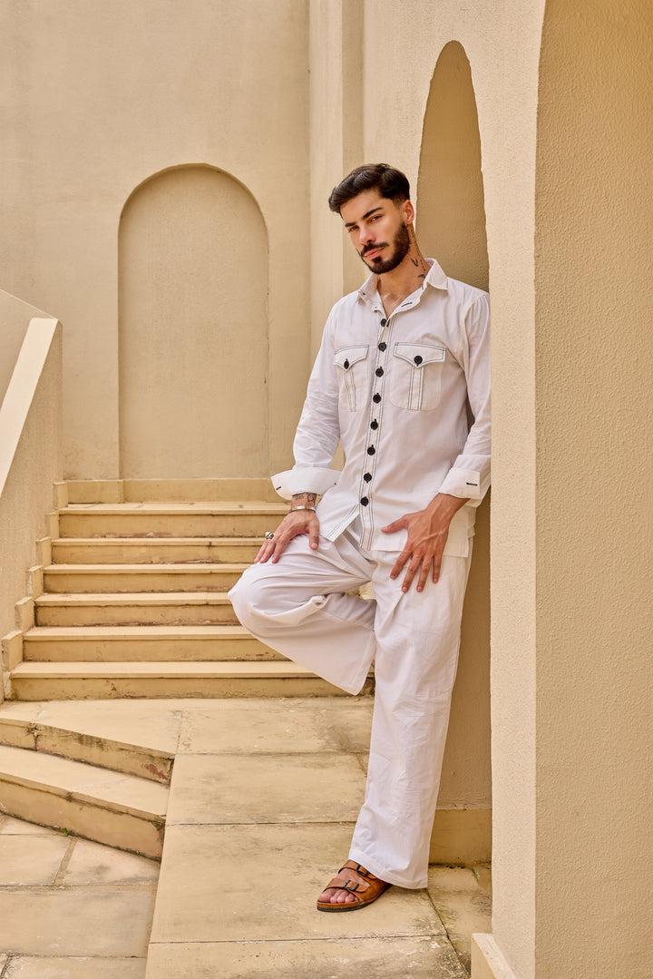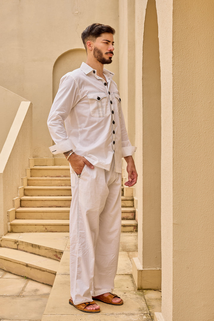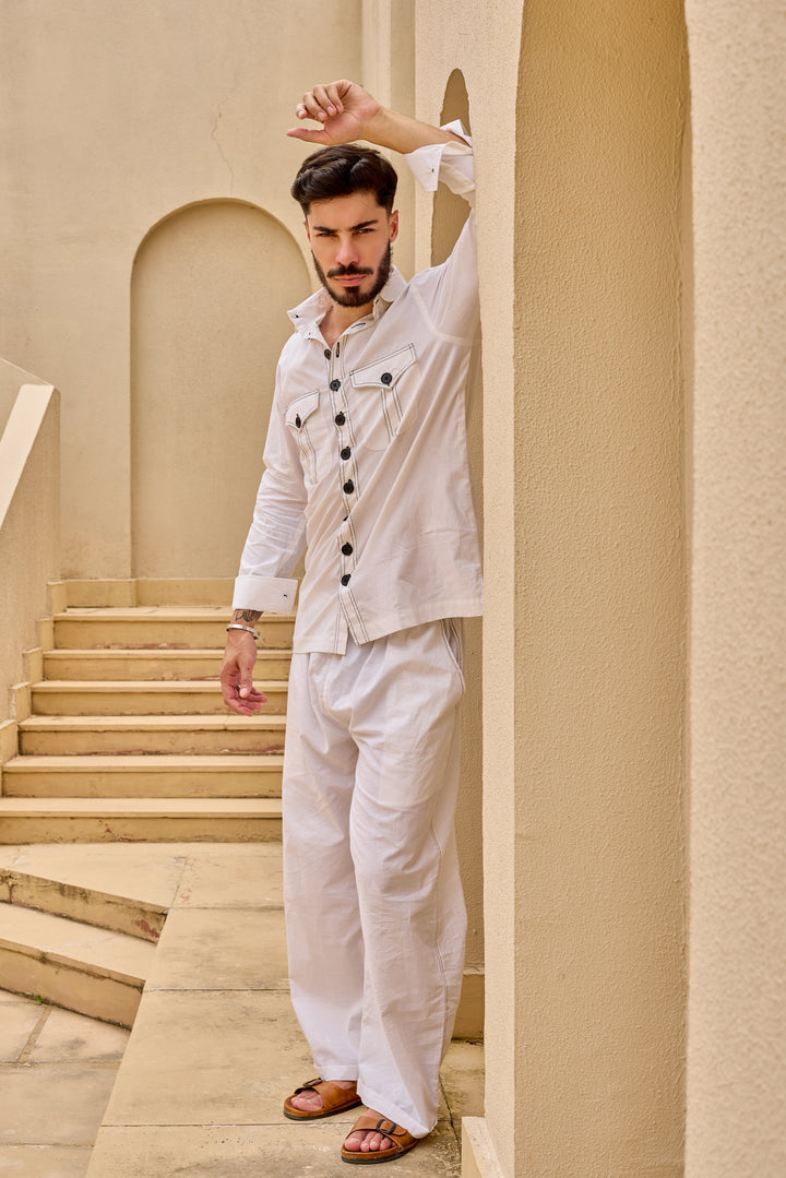 Matching white wide-leg pull on trouser , offering a comfortable and flowing fit that complements the shirt’s relaxed aesthetic.