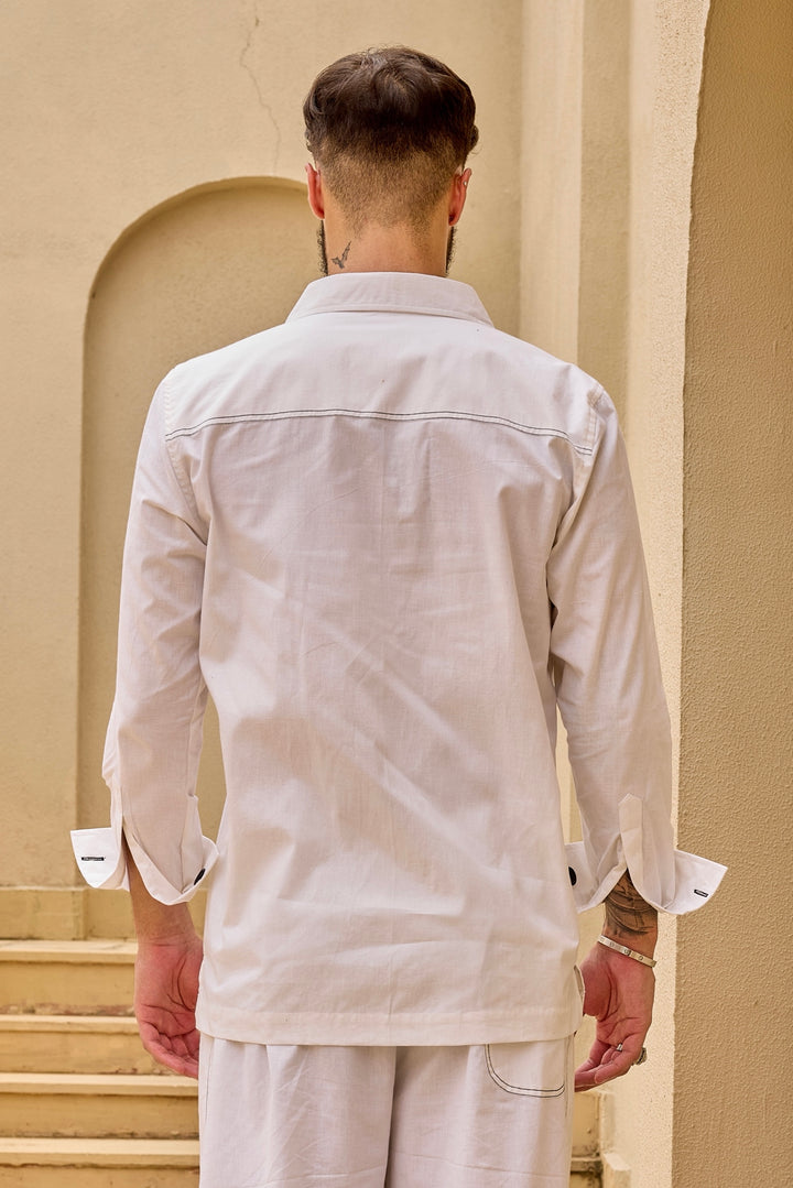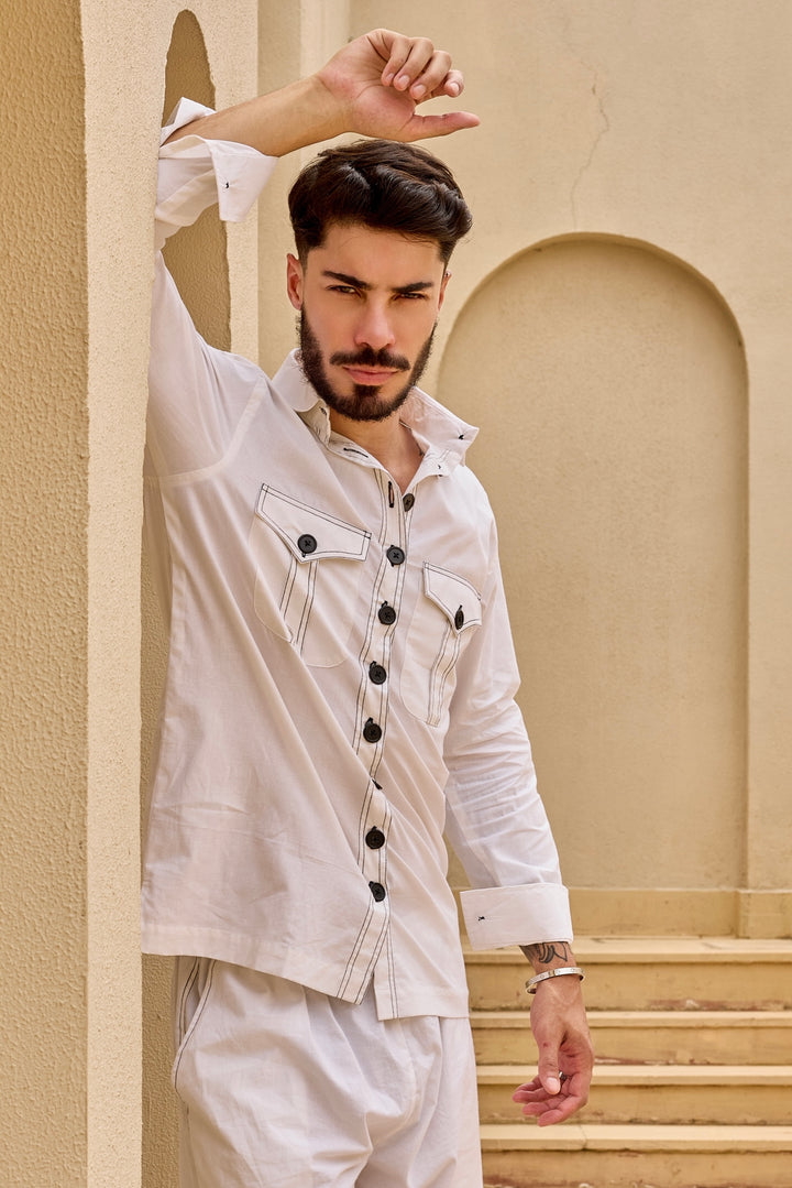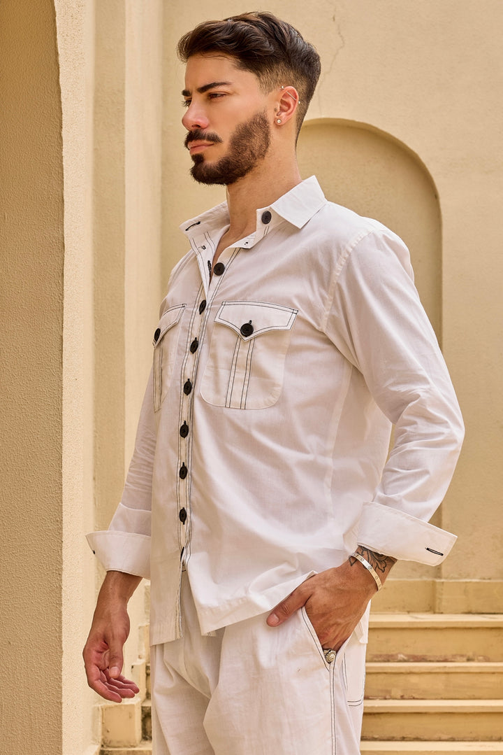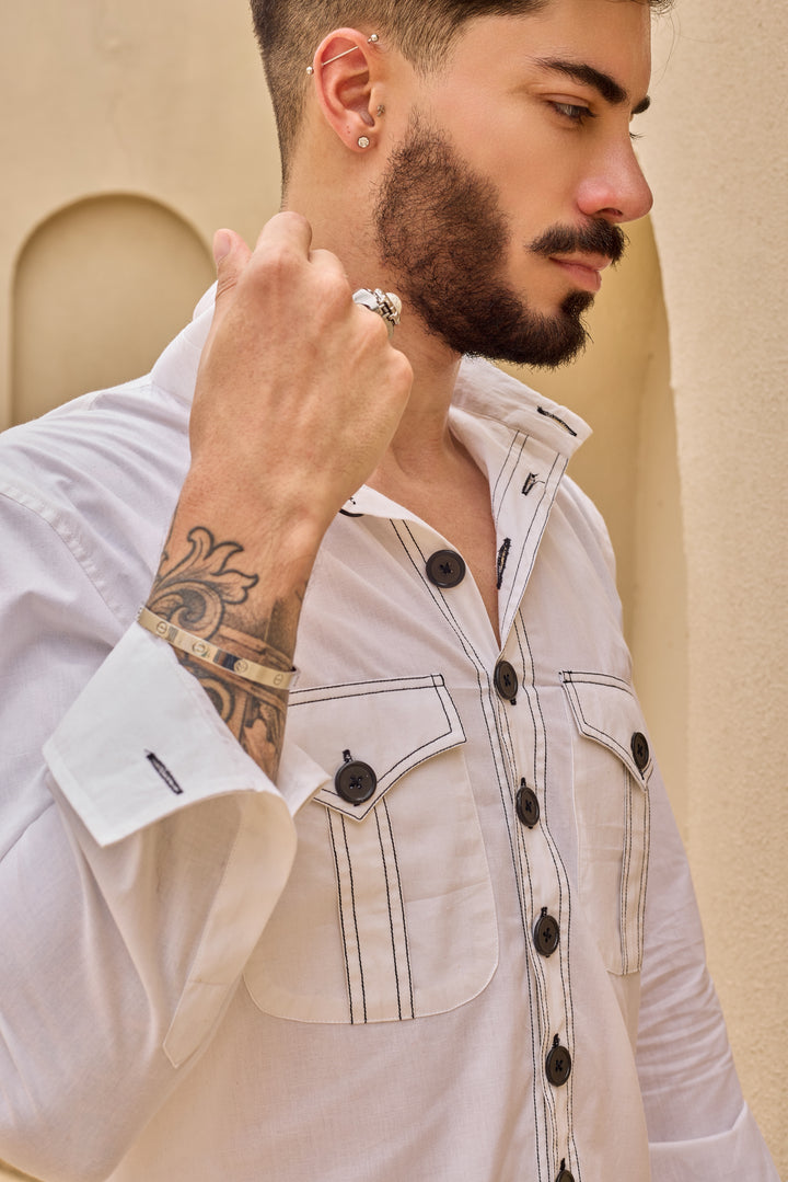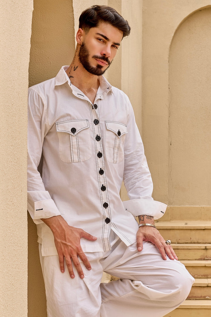It includes two chest pockets with button flaps, a spread collar, and prominent black buttons. The sleeves are rolled up slightly, adding a casual touch.