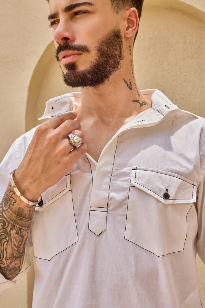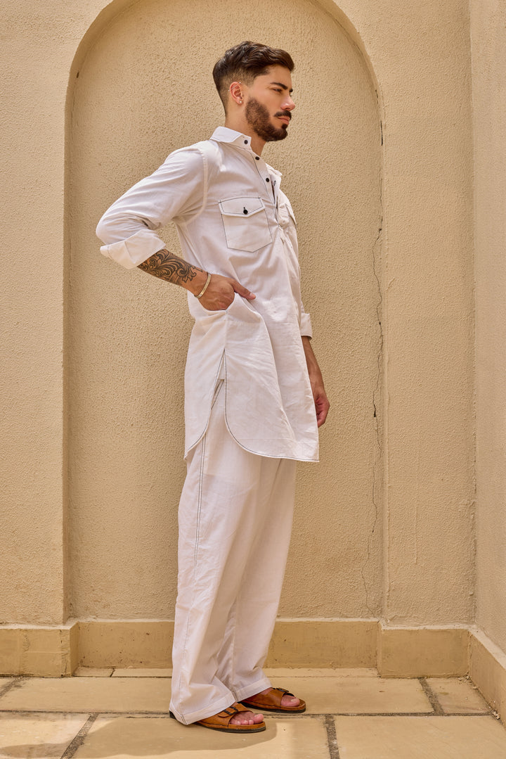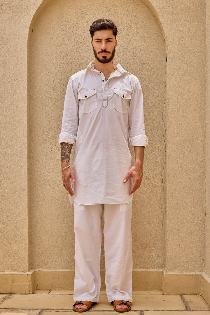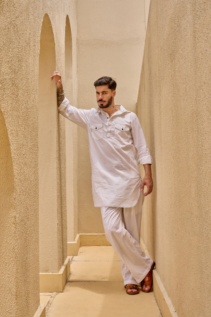 It features a button-down front with a short placket, two chest pockets with flaps, and long sleeves that are rolled up to the elbows. The kurta is paired with matching Pull on trouser.