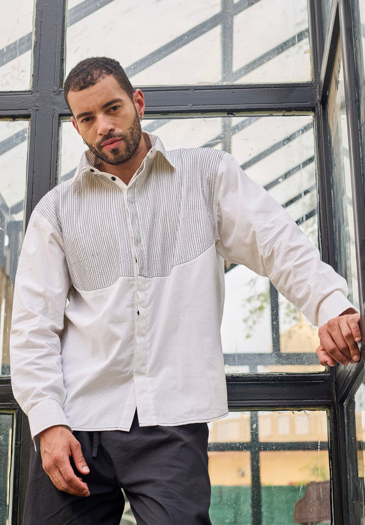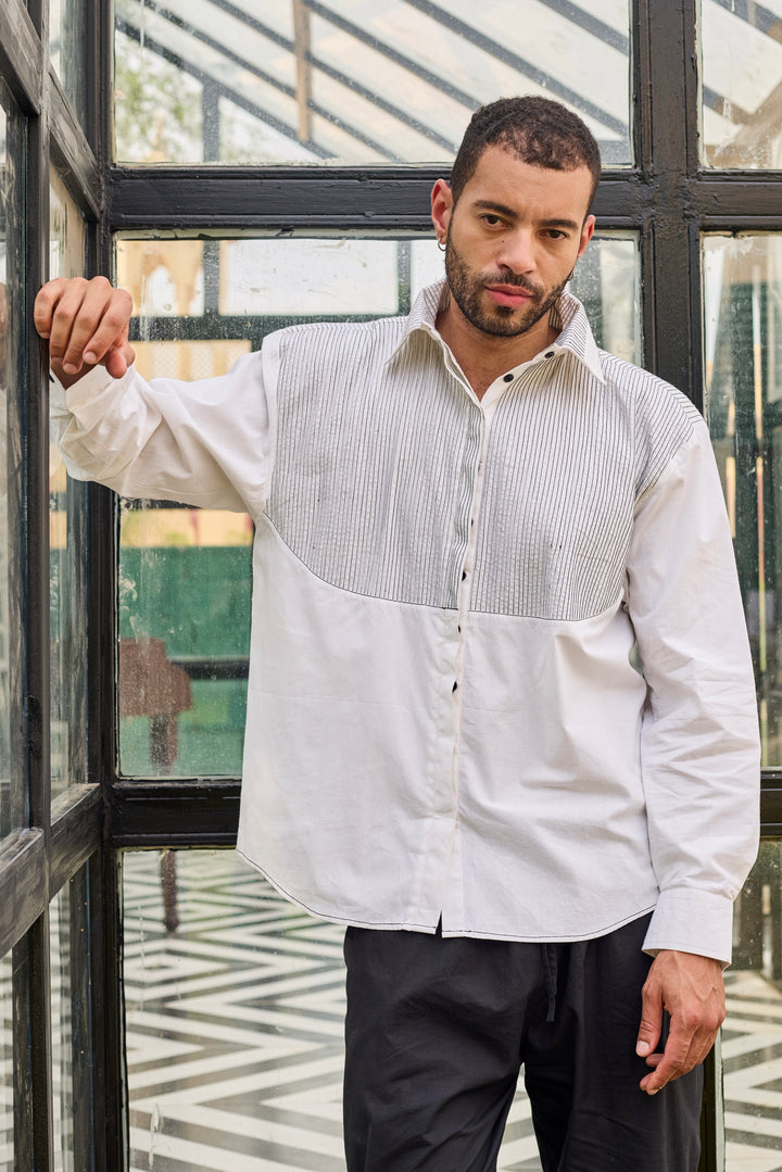 The outfit features a white pintex shirt with a unique design, including a contrasting pintex panel across the chest and upper torsO .